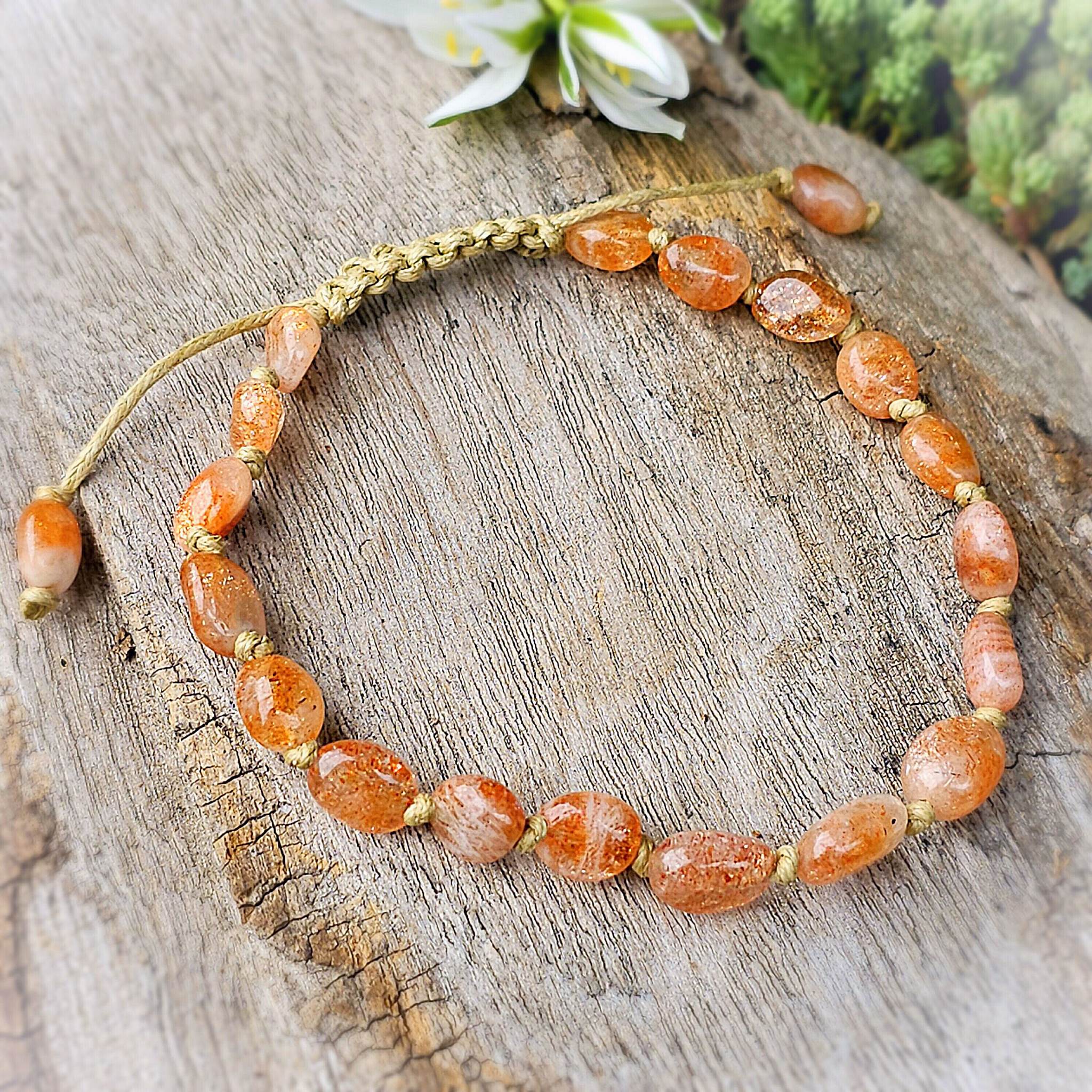 Karkötő dobcsiszolt Napkő szemekből. Csúszócsomóval állítható csuklóméret 16-19 cm között.