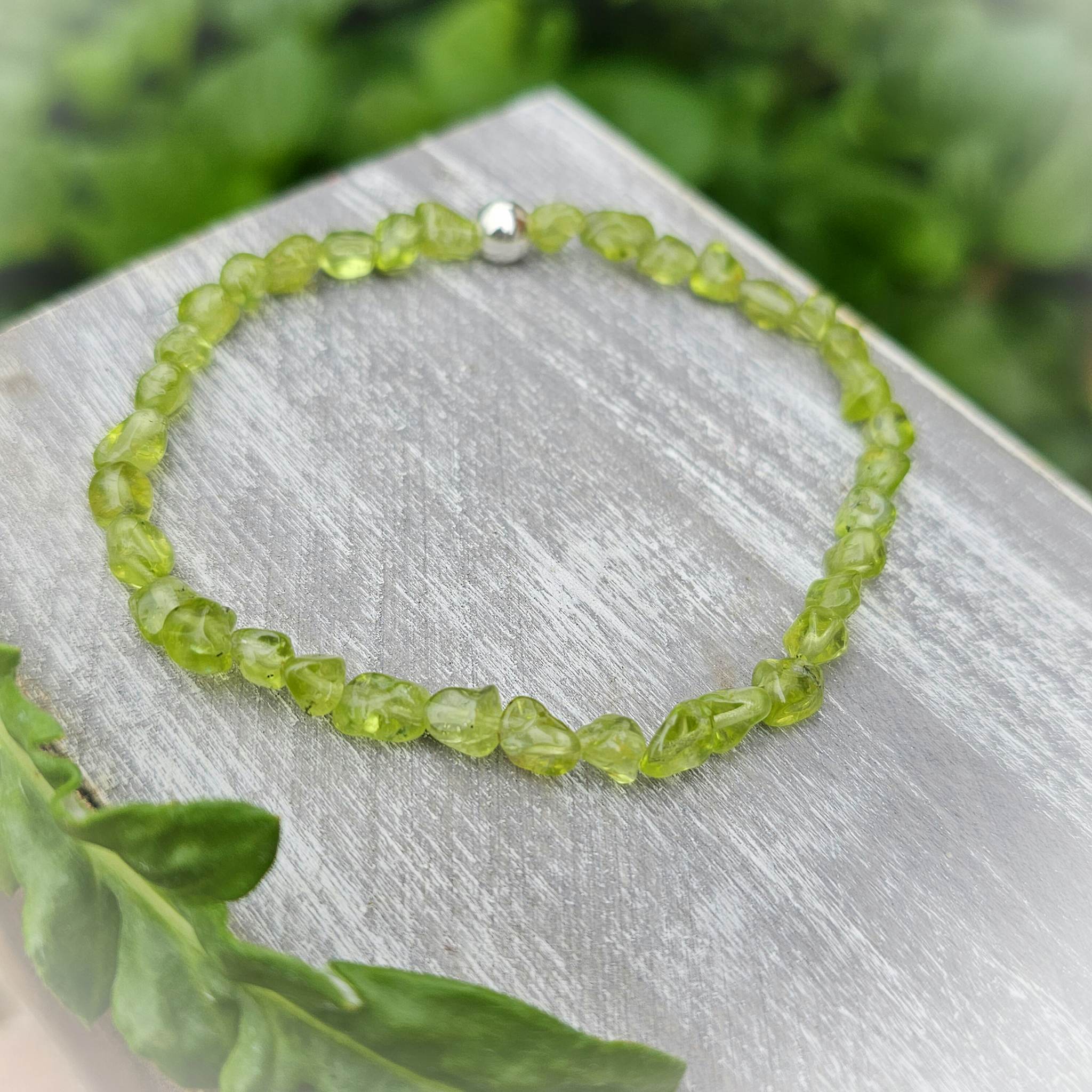 Karkötő dobcsiszolt Olivin szemekből, 1 db orvosi acél gyönggyel.