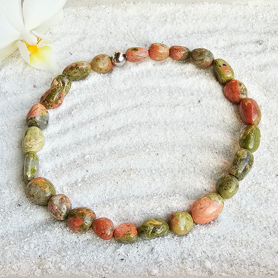 Karkötő dobcsiszolt Unakit szemekből, 1 db orvosi acél gyönggyel.